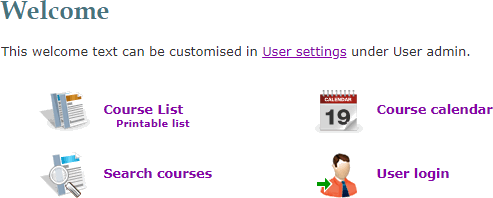 From this page you will be able to access the course list, calendar, search and the user login. Clicking on any of the titles next to the icons will direct you to that area of Maxcourse.