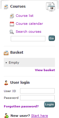 There is also the right hand menu bar, which has shortcut links to the courses, the ability to alternate your screen between a computer and mobile site, view your basket and login area.