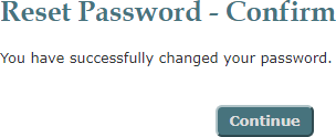 The Reset Password - Confirm page will confirm that you have reset the password. Click Continue to go back to the Maxcourse home page.